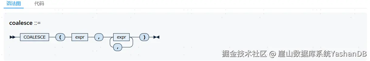 COALESCE函数在多个expr的值中,查找到第一个不为空的expr值,并将其返回,未查找到时返回NULL。expr的数量最少为2个,最多为100个。