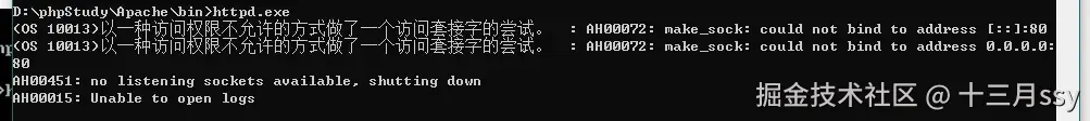 报了“(OS 10013)以一种访问权限不允许的方式做了一个访问套接字的尝试。 : make_sock: could not bind to address 0.0.0.0:80”的错误。从网上查是是端口冲突,仔细检查发现80端口被IIS占用了。