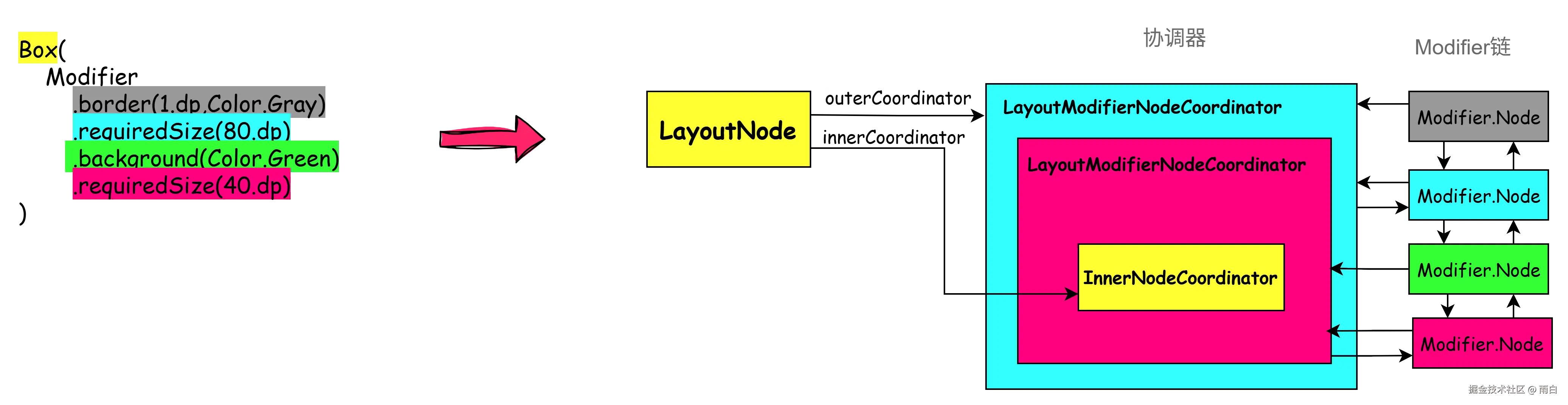 每个LayoutNode对象都有一个outerCoordinator,它是NodeCoordinator类型,负责协调这个LayoutNode的所有修饰符,简单来说它维护了当前LayoutNode的修饰符链。outerCoordinator是最外层的协调器,代表了修饰符链的起点。