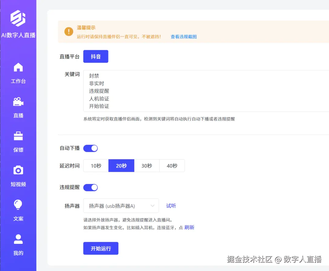 开播后,AI直播保镖实时监控抖音直播画面,直播时出现违规提醒、人脸验证时,自动发出警报声提醒,10秒倒计时自动关播。