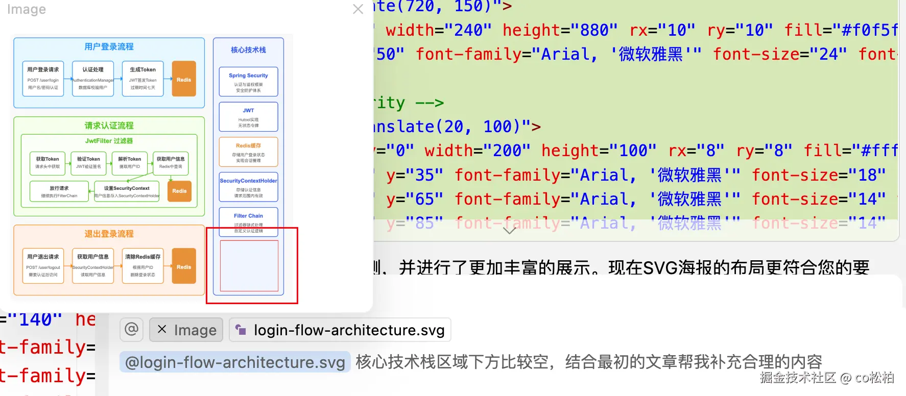有一个小技巧,可以使用截图工具先截图,然后直接粘贴到 Cursor 输入框,AI 即可读取图片内容。甚至还可以将某些地方用框圈起来,让 AI 更有目的性的修改和完善。比如上述架构图的技术栈区域下方有点空,我会通过 AI 这样调整: