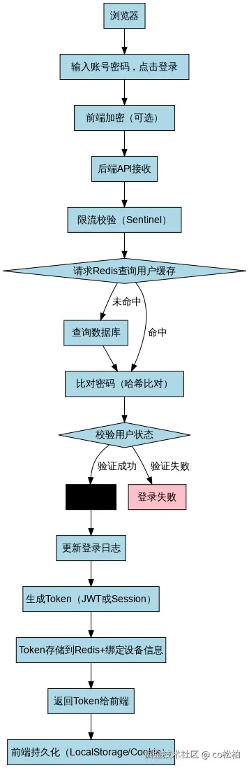 [登录成功 → 更新登录日志 → 生成 Token(JWT 或 Session)]