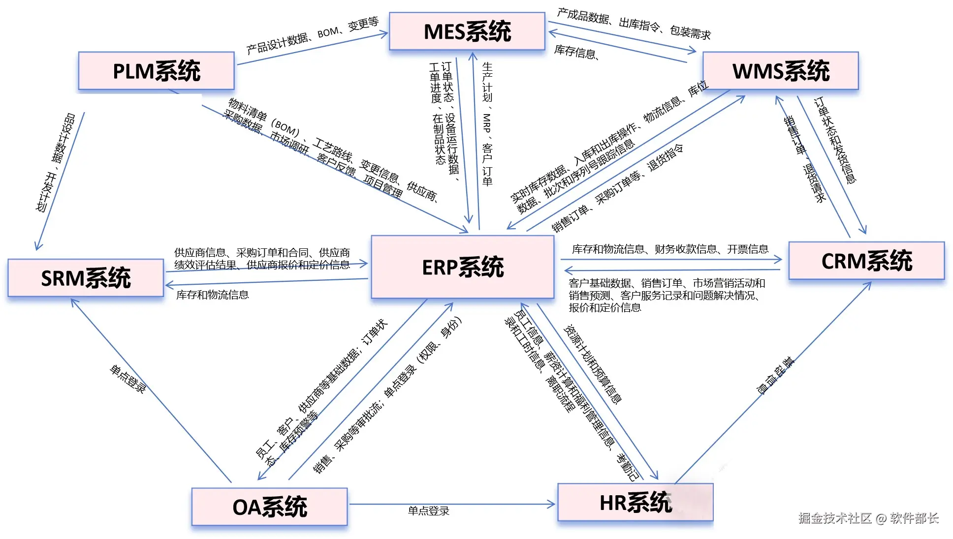 - CRM反馈客户需求→PLM设计新产品→MRP计算物料→APS排产→MES执行→WMS发货→SRM优化供应链→最终数据回流CRM评估客户满意度。