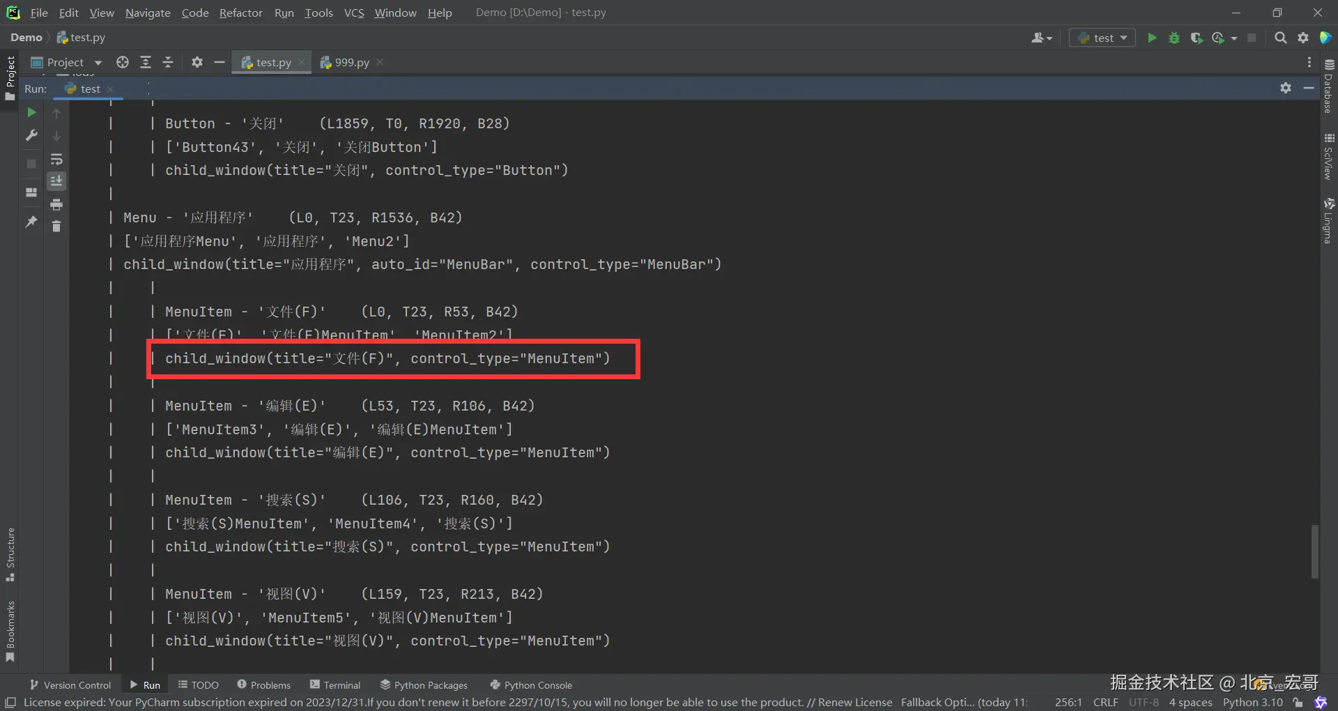 2.按照前边宏哥讲解的方法,查看控件的结构树,宏哥这里为了让大家看清楚使用代码打印出来,然后找到 文件(F) ,这就是我们要定位的,如下图所示: