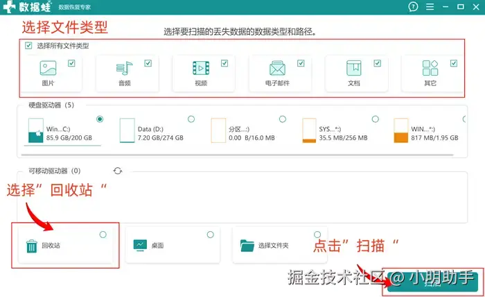 步骤1: 在软件的首页上,用户可以直接勾选需要恢复的文件类型和“回收站”,完成选择后点击“扫描”;