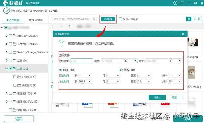 步骤2: 在扫描完成后,如果扫描出来的文件过多,可以选择使用“筛选器”,在里面选择目标文件的相关信息,缩小文件搜索范围后,可以更快找到目标文件;