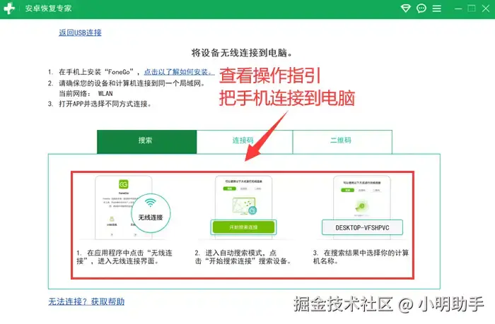 步骤1: 打开软件,查看主页面的操作指引,把手机连接到电脑。然后,软件就会检测到手机,立刻进入工作状态。