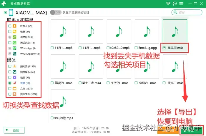 步骤3: 扫描完成后,软件会展示一份详细的报告。在这里,你可以点击左栏的类型,切换到需要的项目,再浏览数据。勾选你需要恢复的对象,点击【导出】。