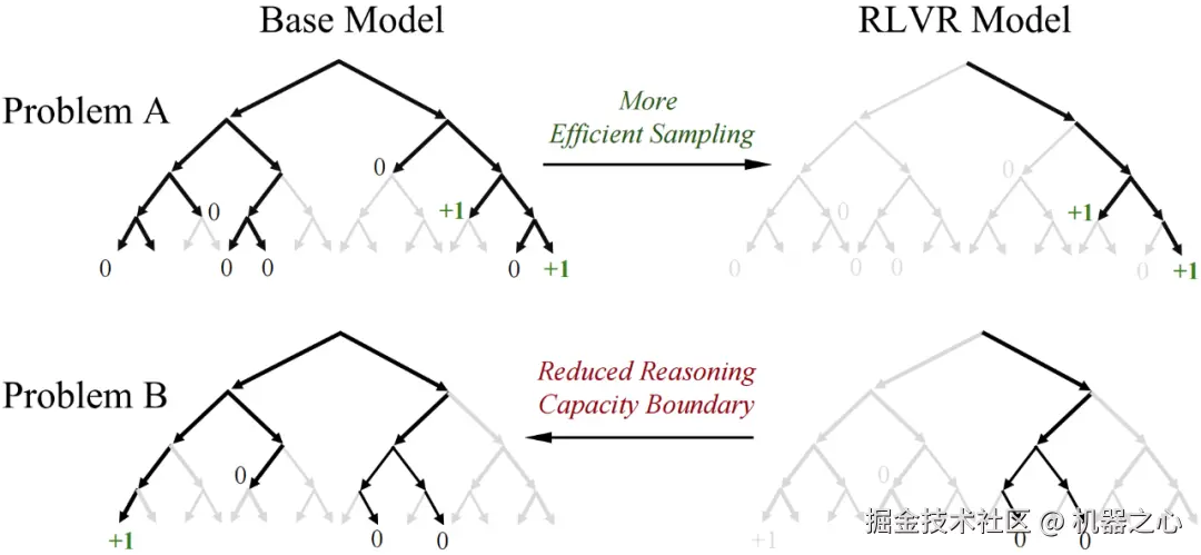 对于某些问题(如问题 A),RLVR 训练会偏向奖励路径的分布,从而提升采样效率;但代价是推理范围的缩减:对于其他问题(如问题 B),基础模型包含正确路径,而 RLVR 模型却可能丢失该路径。)