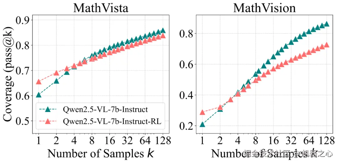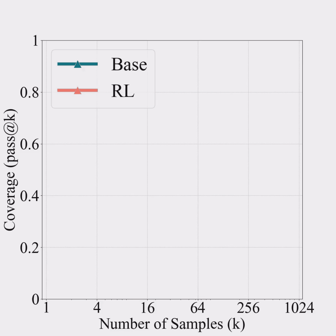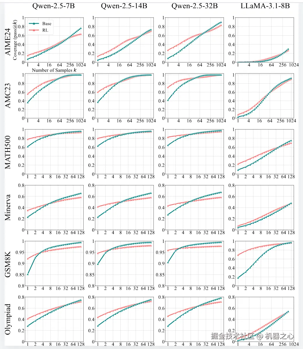 RL 模型在小 k 时占优,然而基座模型在大 k 时逆袭:在数学题、代码生成和视觉推理等任务中,RL 模型在 pass@1 上的表现显著优于基座模型。而当采样次数增至数十或数百时,在所有基准测试和 LLM 模型家族中,基础模型的表现会无一例外地逐渐追平强化学习训练的模型,并最终实现反超。