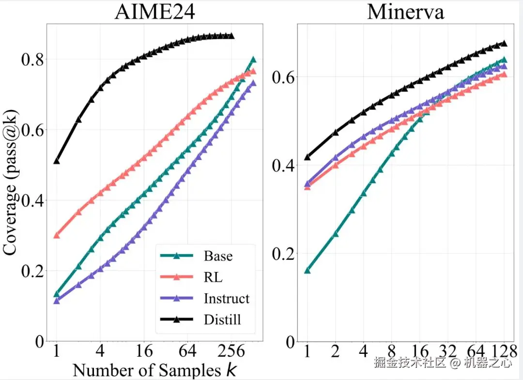 研究团队还发现,RLVR 与蒸馏训练存在本质区别。RL 仅能提升采样效率,而蒸馏训练能真正为模型注入新知识。因此蒸馏模型通过学习蒸馏数据往往能拓展基础模型的推理能力边界,这与能力始终受限于基础模型的 RLVR 训练模型形成鲜明对比。