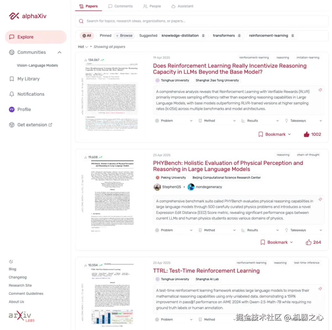这篇工作刷新了 AI 圈里的「普遍认知」:此前各类基于 RLVR 做后训练的大模型,如 OpenAI 的 o1、DeepSeek-R1 等,在各项评测中成绩显著,似乎它就能让大模型实现「自我进化」,赋予模型超越其基座模型的能力。然而,此项研究指出,RLVR 的潜力并不像之前认为的那样强大 —— 它并不能使模型解决基础模型无法解决的问题。论文一经发出,就获得国内外学者的广泛关注,发布首日即登顶 Hugging Face 日榜和 alphaxiv 榜首,在 Twitter 上累计接近 30 万次浏览,引起大量讨论。