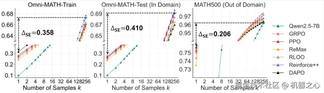 那么,不同的 RLVR 算法在此问题上是否表现出差异?对比实验发现,各 RLVR 算法表现相似且均远未达最优。