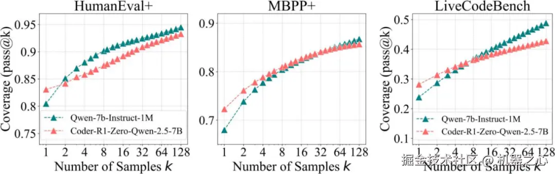 值得注意的是,生成的代码必须通过所有测试样例,几乎不可能蒙对正确答案,模型必须真正写出符合逻辑的代码才能得分。代码生成任务的实验结果同样支持前述的核心发现:RLVR 强化学习模型 CodeR1-Zero-Qwen2.5-7B 提升了单样本 pass@1 得分,但在更高采样次数(k=128)时降低了覆盖范围。原始模型在更大的 k 值下仍展现出持续改进的潜力,而 RLVR 的性能则趋于稳定。