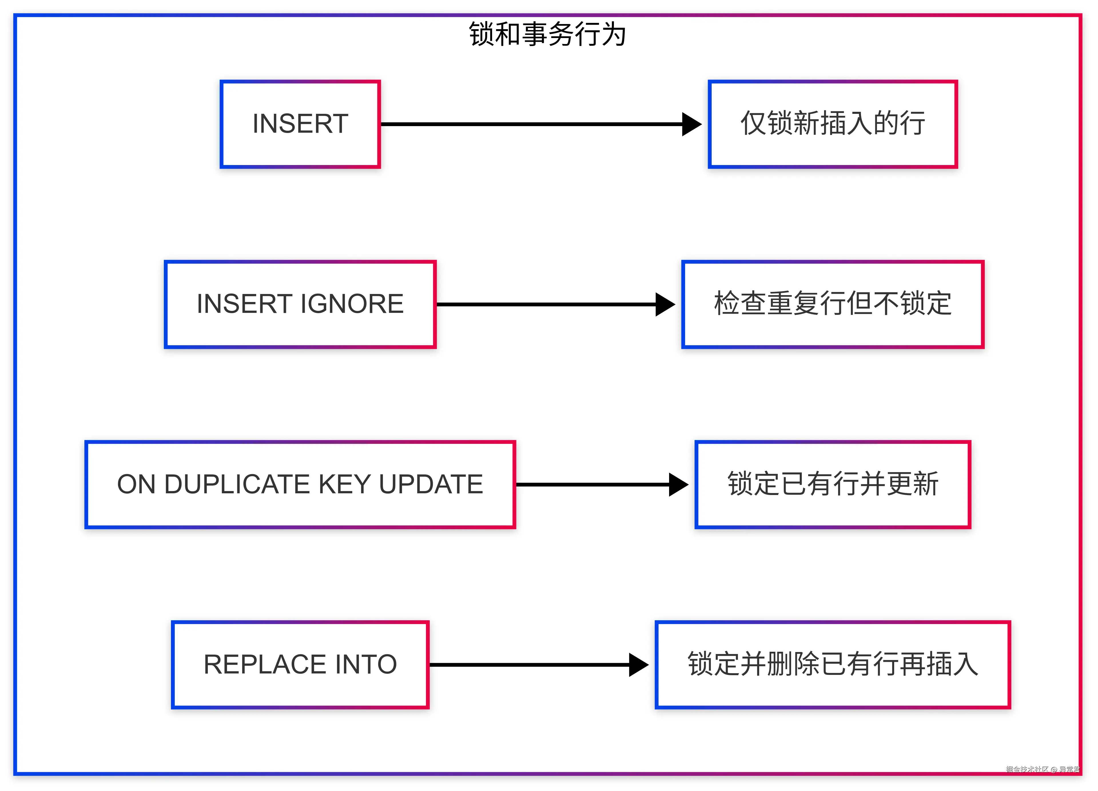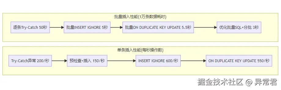 | INSERT IGNORE | 语法简单,性能最佳 | 无法获知哪些记录被忽略 | 只需插入不存在记录场景 | 仅冲突行 | 简单 | 低 | 低 |