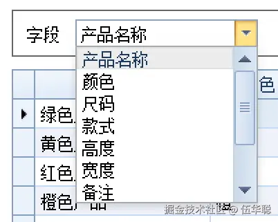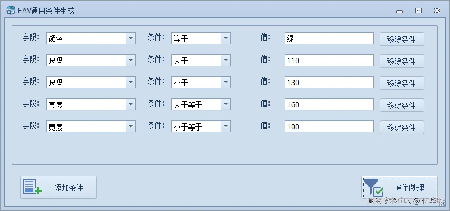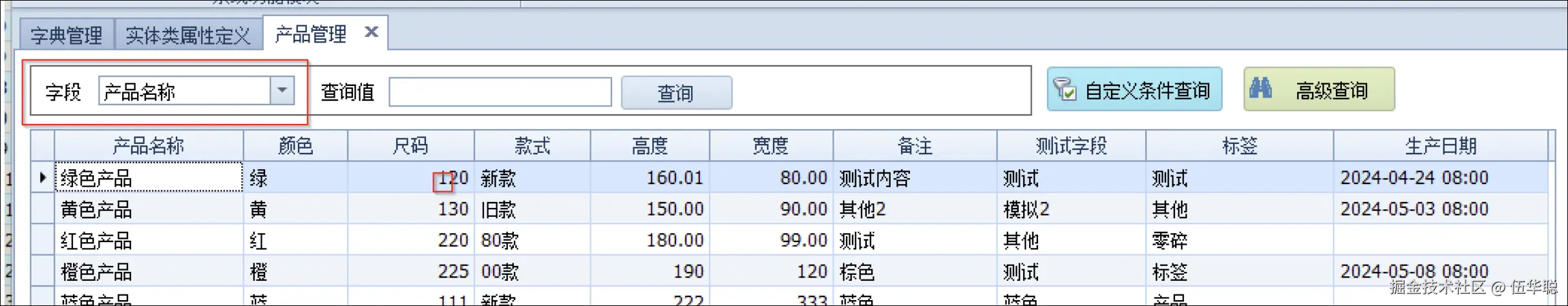 由于我们的表字段是动态化构建的,因此查询字段就也就需要动态化了,我们把查询字段通过列表选择的方式,条件根据不同的数据类型,创建不同的输入控件来实现查询处理。