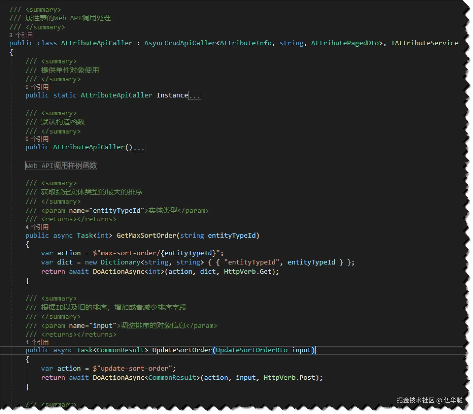 Web API的ApiCaller调用封装类,主要就是调用基类实现数据的调用和解析处理即可。如对于字段属性的ApiCaller的接口调用封装,如下所示。