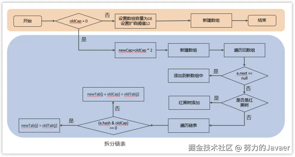 3.如果是链表,则需要遍历链表,可能需要拆分链表,判断(e.hash & oldCap)是否为0,如果是0,那么就停留在原始位置,否则,移动到原始位置+增加的数组大小这个位置上