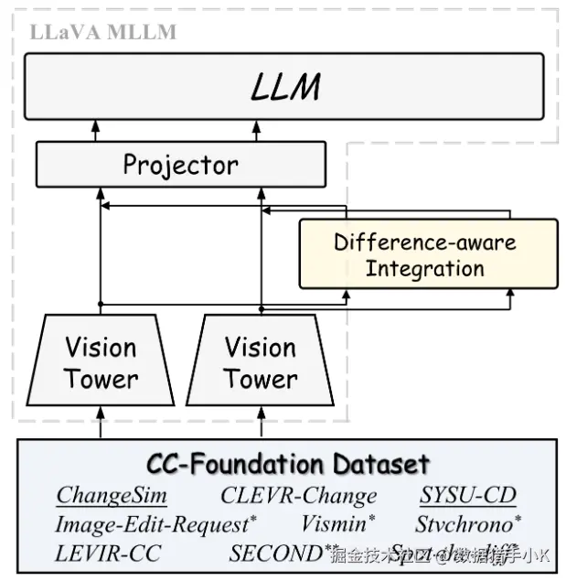 拟议的基于 MLLM 的 CCExpert 和 CC-Foundation 数据集的基本组件。* 表示数据集已经过重写和优化,下划线表示由 GPT-4o 生成的数据集,** 表示已经过专家注释和优化的数据集。