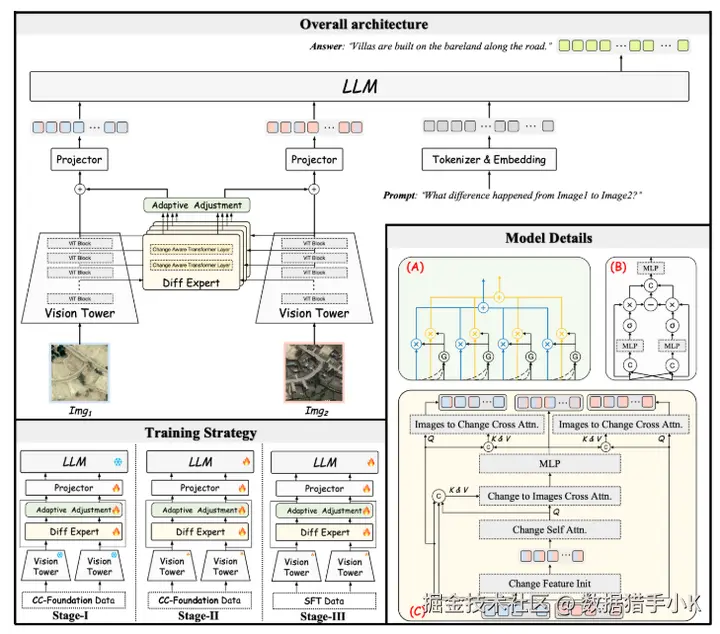 CCExpert 的整体架构、组件细节和训练策略。模型详细信息(A):自适应调整模块;模型详细信息(B):Change Aware Transformer Layer 中的 Change Feature Init 模块;模型详细信息(C):Change Aware Transformer 层。
