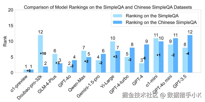 不同 LLMs 在 SimpleQA 和中文 SimpleQA 上的排名。