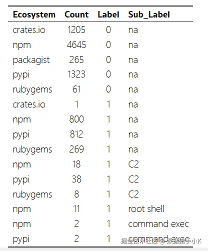 OSPTrack数据集包含9461个包报告(其中1962个为恶意),涵盖了npm、pypi、crates.io、nuget和packagist等多个生态系统。数据集包含了详细的子标签,用于攻击类型的验证信息,有助于在源代码访问受限的情况下识别恶意指标,并支持在运行时进行有效的检测方法。