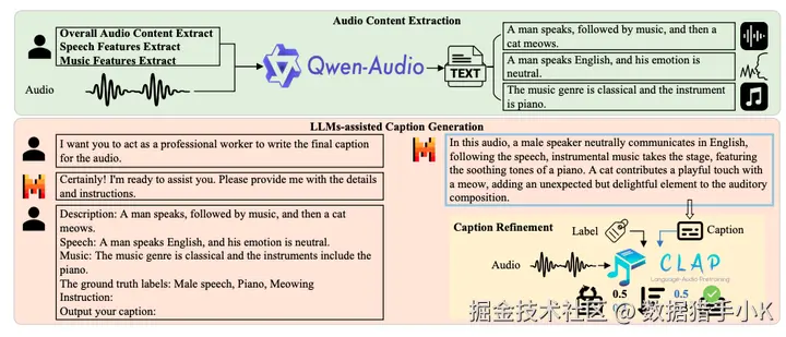 包括音频内容提取、LLMs辅助字幕生成和字幕精炼三个部分。使用Qwen-Audio ALM提取音频内容,Mistral-7B LLM生成字幕,并采用LAION CLAP评估字幕质量。
