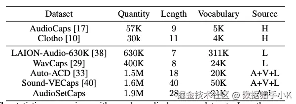 与流行的音频语言数据集的统计比较。长度:平均字幕长度;词汇量:字幕的词汇量大小。字幕来源:H(人类),A(音频模型),V(视觉模型),L(语言模型)。