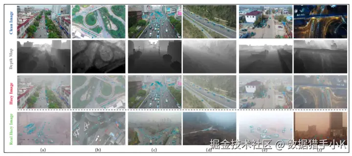 HazyDet 中的图像和注释:第一行和第二行显示正常天气条件下的图像及其深度图;第三行显示合成雾度图像;第四行显示来自 RDDTS 的真实数据。在 (a) 和 (b) 中,显示了透视的变化(例如倾斜和垂直);在 (c) 和 (d) 中,显示了场景的变化(例如城市和农村);在 (e) 和 (f) 中,显示光照变化