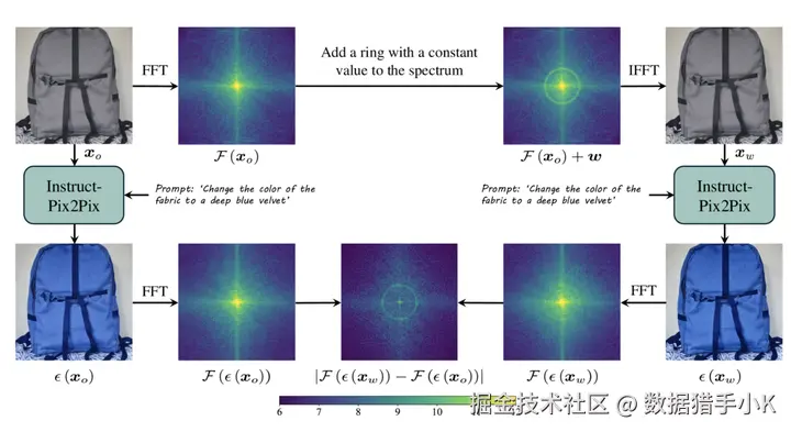 分析图像编辑对图像频谱影响的过程。在此示例中,使用了编辑模型 Instruct-Pix2Pix,表示为 ϵ(⋅) 。该函数 ℱ(⋅) 表示傅里叶变换,我们在对数刻度上可视化其大小。