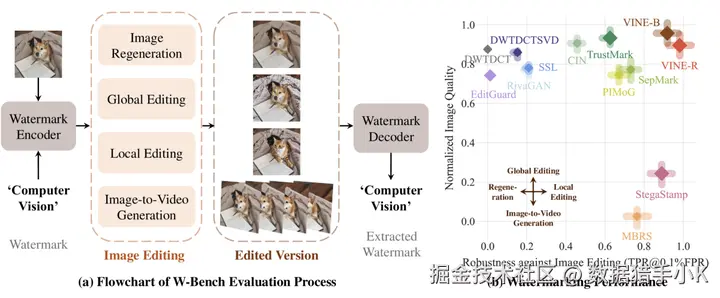 数据集包含了11种代表性的水印方法,涵盖了图像再生、全局编辑、局部编辑和图像到视频生成四种编辑技术。通过分析图像编辑的频率特性,并利用预训练的扩散模型SDXL-Turbo进行水印嵌入,目的解决现有水印方法在面对大规模文本到图像模型生成的图像编辑时的脆弱性问题。
