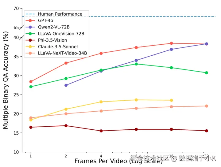 测试显示,即使是最先进的模型,如GPT-4o,在TemporalBench上的问答准确率仅为38.5%,而人类为67.9%,表明AI模型在时间理解上与人类存在显著差距。