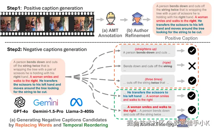 在第 1 步中,我们使用合格的 AMT 注释者为视频收集高质量的字幕,然后对其进行优化。在第 2 步中,我们利用现有的 LLMs 来生成负面字幕,方法是替换选定的单词并重新排序操作序列,然后再自行过滤它们。