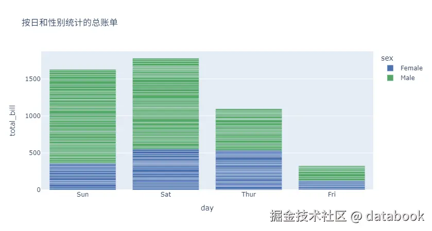 df, x="day", y="total_bill", color="sex", title="按日和性别统计的总账单"