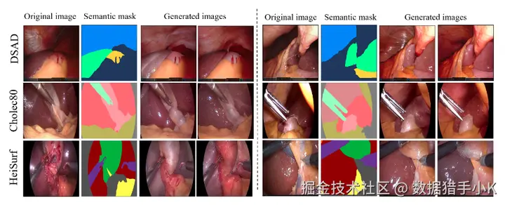 使用我们的扩散方法为三个不同的手术数据集(由左侧名称表示)生成的多类手术图像(生成图像列)及其相应的语义掩码。我们的方法可以使用分割掩码作为掩码和调节信号来生成逼真和多样化的器官纹理。