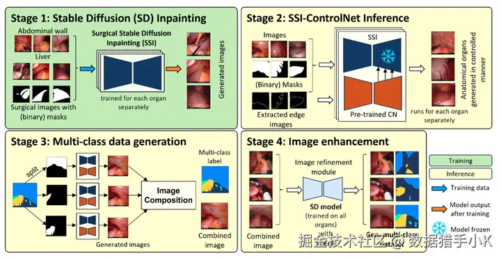 生成多类数据集的扩散方法概述。阶段- 1 涉及分别使用每个器官的真实图像和蒙版来训练 SD 修复模型。在 stage- 2 ,将预先训练的 ControlNet 插入 SSI 模型 (SSI-CN) 中,以使用从分割掩码中提取的边缘精确生成每个解剖结构。舞台中的图像构图- 3 包括从生成的图像中切下每个器官并将它们组合在一起