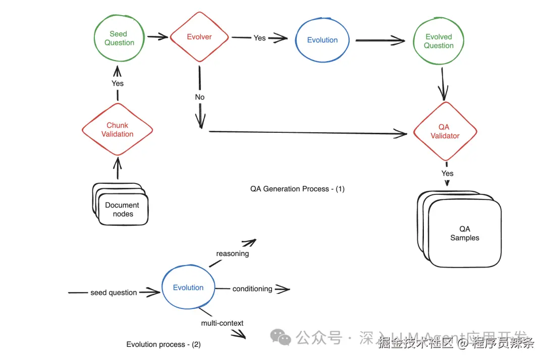 ragas 在生成数据集上还可以配置问题的难易分布。理想的评估数据集应涵盖生产中遇到的各种类型的问题,包括不同难度级别的问题。大语言模型(LLMs)通常不擅长生成多样化的样本,因为它们倾向于遵循常见路径。ragas 受 Evol-Instruct[2] 等作品的启发,采用了一种进化生成范式,系统地从提供的文档集创建具有不同特征的问题,如推理、条件、多个上下文等。这种方法确保了对管道中各个组件性能的全面覆盖,从而实现更稳健的评估过程,原理如下图所示。