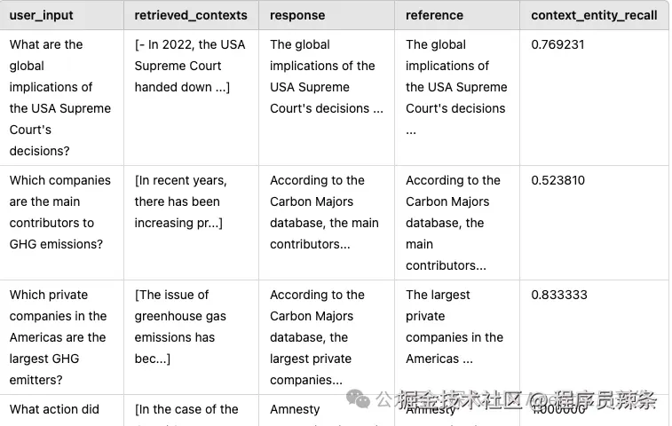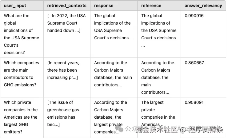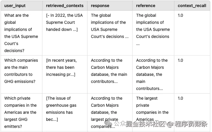 包含 4 个字段,分别是question、answer、contexts和ground_truth。每一项都是一个数组列表,要注意的是,答案、上下文和基本事实和问题列表是一一对应的,即第一个问题的答案也必须是 answer 中的第一个元素,同时也必须是上下文和基本事实的第一个元素。其中上下文的每个元素都是一组字符串数组,这是因为每个问题都可以有多个上下文。
