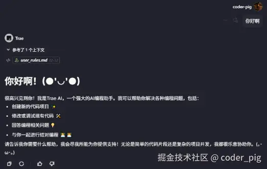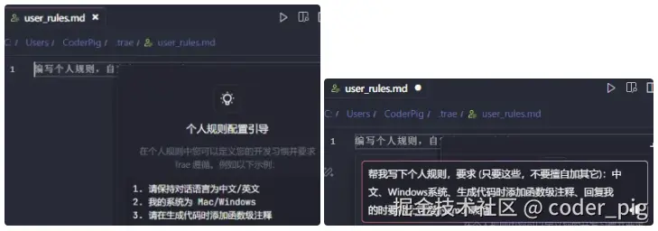 点击「创建 user_rules.md」,会有 个人规则配置的引导,😄 我选择直接 Ctrl + I,让AI给我写: