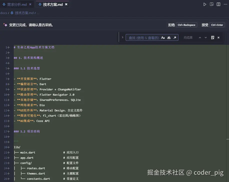 😶 接着就是让 Trae 根据生成的 需求文档.md 生成 技术方案.md 了,直接输入提示词: