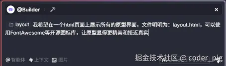Trae 不能直接生成 UI示意图 (Cursor也不行🤣),😏 但可以做下变通,如:用ASCII字符画页面布局、以HTML的格式生成UI/UX设计图、输出SVG源码 等。这里采用第二种,键入提示词: