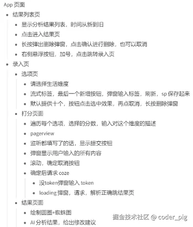 复制下来,填完,再发给GPT,让它 分析和给出建议,😄 我觉得这种方式挺好的,但是还是麻烦,如果能直接录数据,然后得出分析结果,就好了🤔。✨昨晚地铁回家路上,文思泉涌,脑海里逐步构建起APP的雏形,快速记下 灵感大纲 💡: