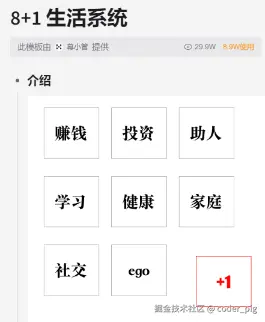 😐 人到中年,愈发迷茫,浑浑噩噩,毫无方向,不知道应该干嘛,于是乎我尝试拾起了书📖,尝试从中寻找答案。持续了一阵子的 高强度读书(每周20h+) 后,我反而更迷茫了😑,好像懂了更多的东西,但生活依旧波澜不惊,😶 我意识到,真的想有所改变,还需要配合行动,而行动的第一步,就是 发现问题,我需要一个 分析工具。在 幕布的模板库,我发现了一个「8+1 生活系统」: