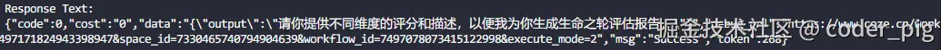 点击 完成,会生成 Token令牌,点击右下角复制,只会显示一次,记得保存好,忘了只能删了重新创建 ❗️ 接着点击 扣子 API → Playground → 工作流 → 执行工作流,依次输入上面的 Token,工作流id,输入参数 (Json格式),确认无误后,点击右上角 运行,静待 返回结果,如图 正常返回数据,就可以啦~