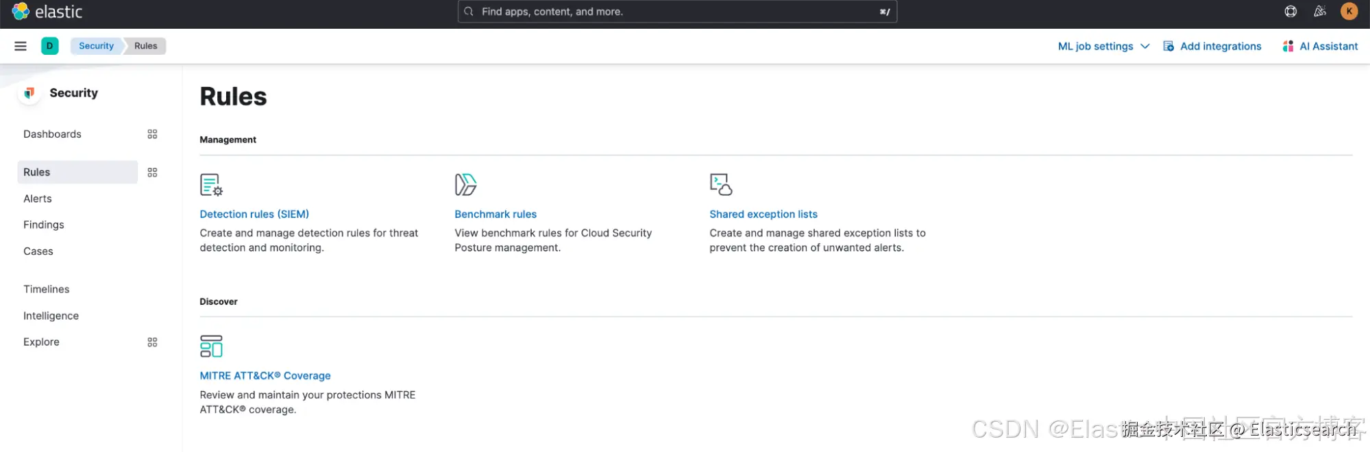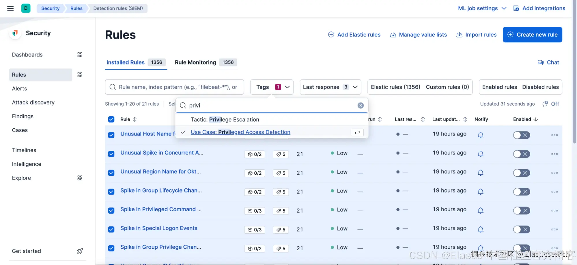 确保上一步中配置的机器学习任务已在运行。然后,导航至 Security > Rules > Detection rules (SIEM),启用与 Privileged Access Detection 检测包相关的 21 条检测规则。