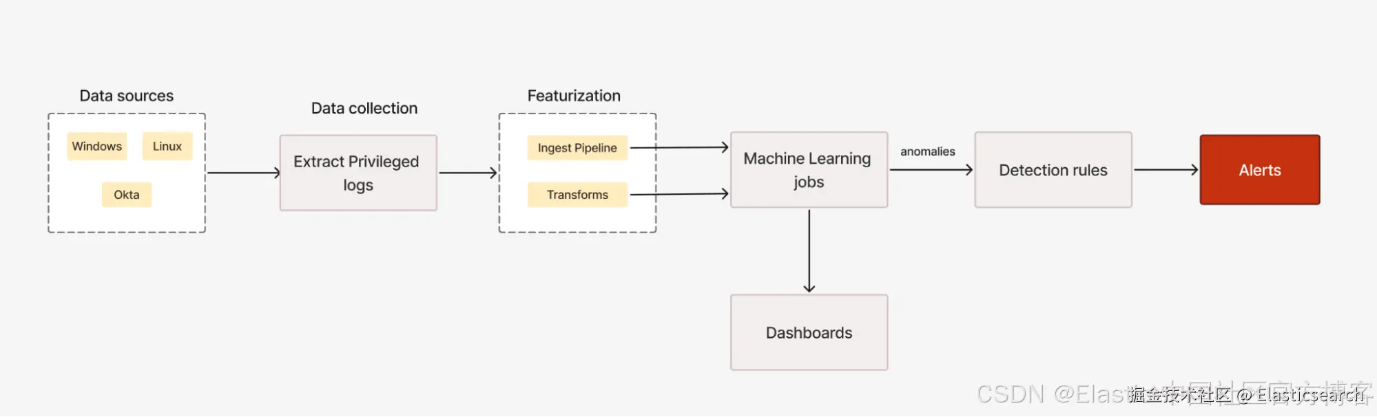 数据准备完成后,下一步是特征提取,即将原始的特权事件日志转换为可用的特征。这些特征是通过 Elasticsearch 的 ingest pipeline 和 pivot transform 创建的,随后由机器学习模型进行分析。
