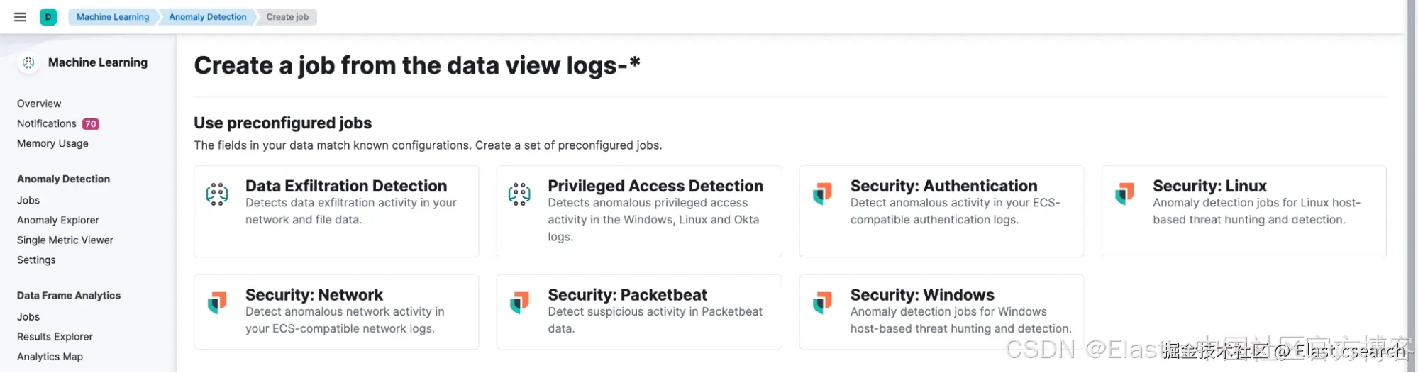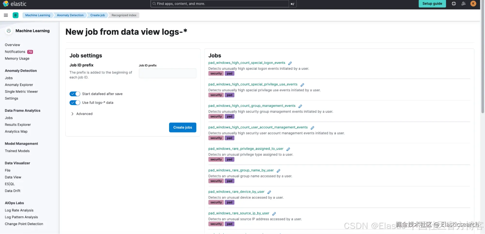创建好用于异常检测的数据视图后,导航到 Machine Learning > Anomaly Detection 并选择 Jobs wizard。点击 Create job 并选择你刚创建的数据视图。在 Use preconfigured jobs 选项下,你将看到 Privileged Access Detection 卡片。
