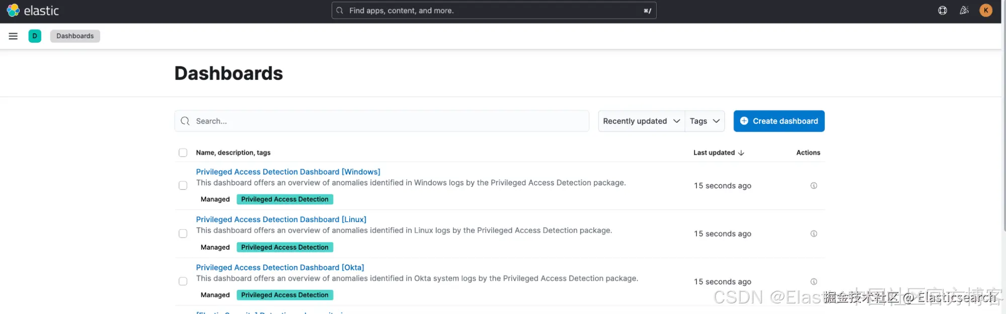 要全面查看生成的异常并获得告警的完整上下文信息,可以使用该检测包中包含的仪表盘。你可以通过 Analytics > Dashboards 访问 Privileged Access Detection 仪表盘,以获得对检测到的异常的全方位视角。