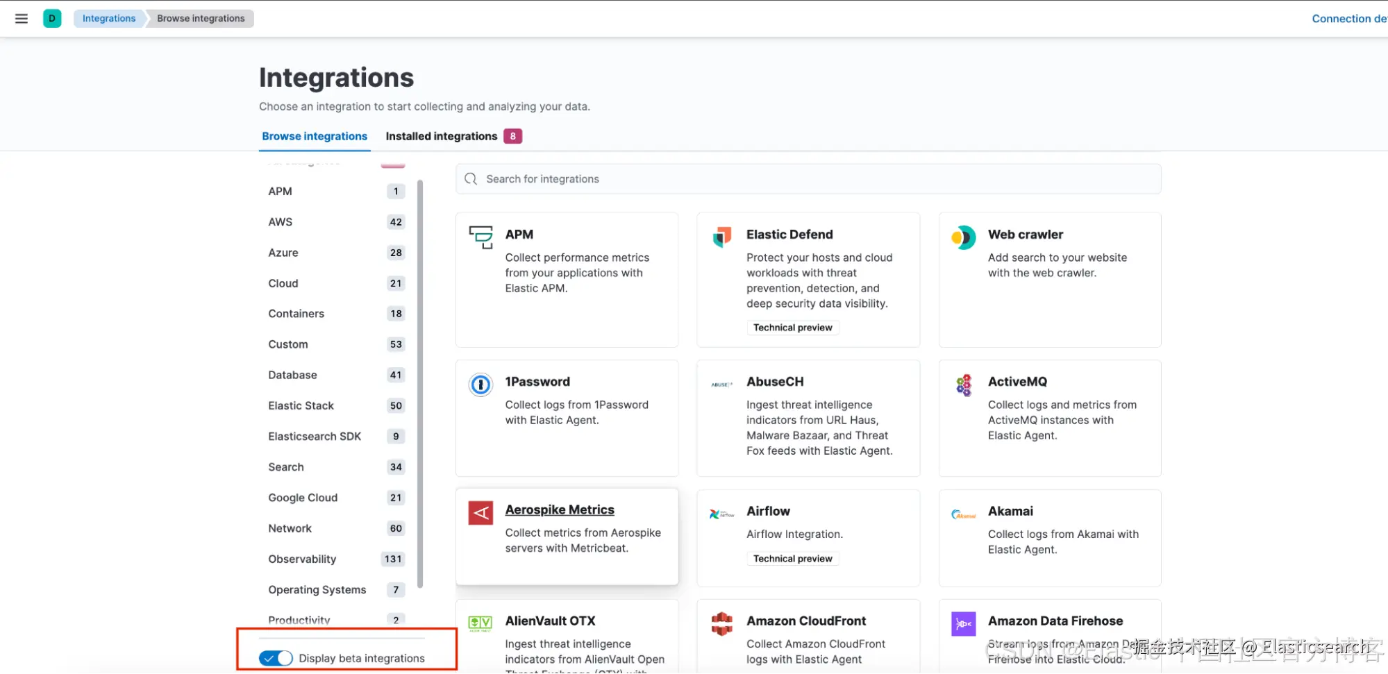 在 Kibana 的 Integrations 应用底部启用 “Display beta integrations” 选项后,你将能够看到该检测包。