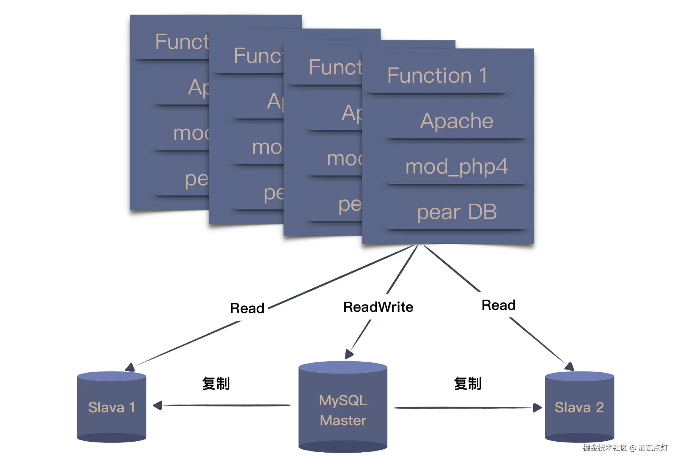 但是,这种做法也带来了一个新的问题,同时连接多个数据库,任何一个数据库出了问题,都会导致整个网站的故障。